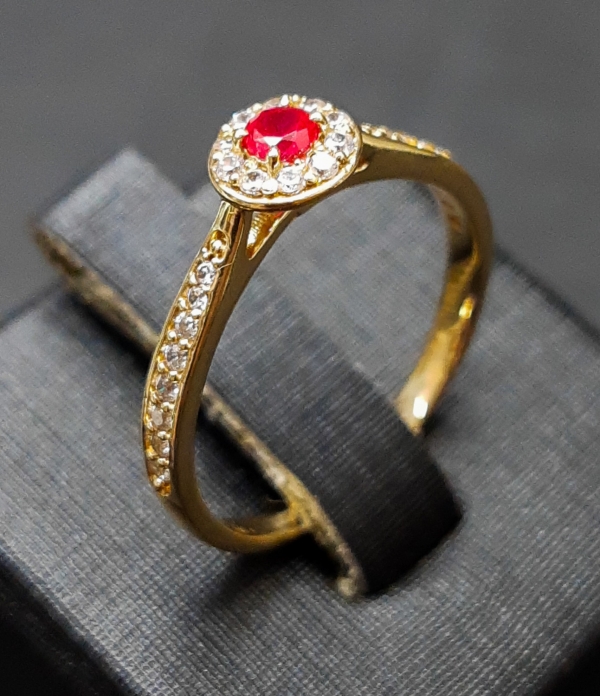Anel 10K com zircônia na lateral e rubi central 1,8g