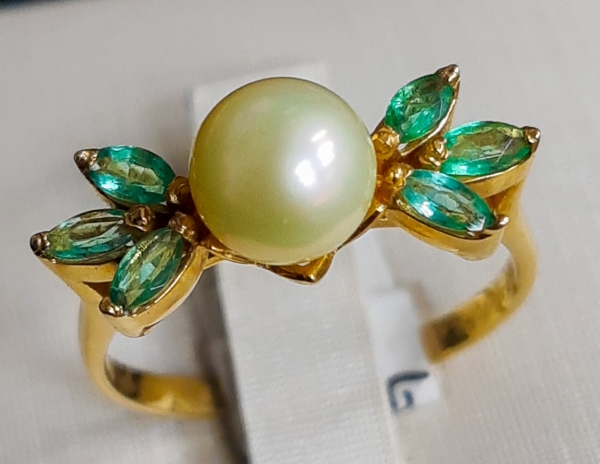 Anel 18K com pérola e esmeralda 3,6g