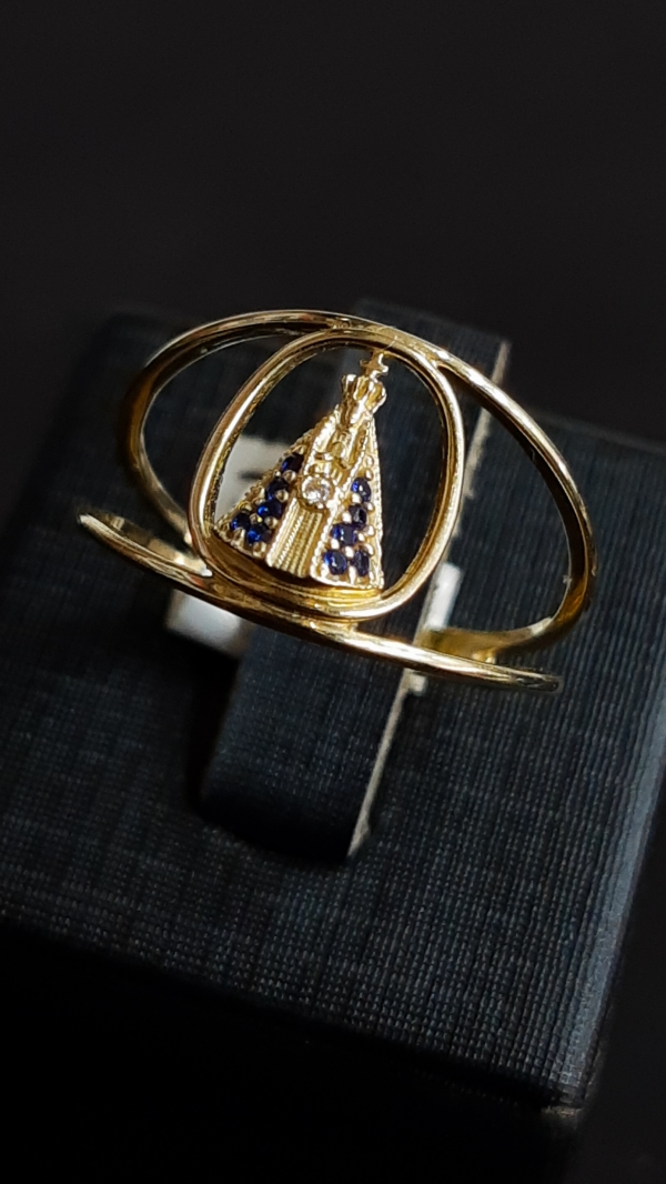 Anel em ouro 10K vazado Nossa Senhora com zircônia