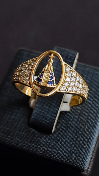 Anel em ouro 10K Nossa Senhora Aparecida com zircônias nas laterais