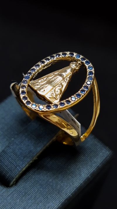 Anel em ouro 10K Nossa Senhora Aparecida com zircônia azul
