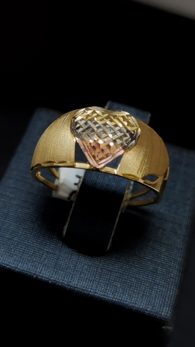 Anel em ouro 10K, três cores, coração com trabalhado fosco