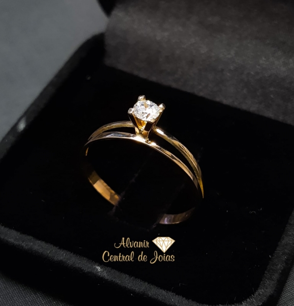 Anel Solitário em ouro 12k com aro duplo e zircônia, peso 1,7g.