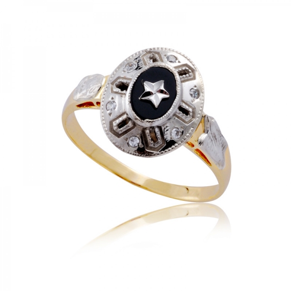 Anel de formatura, Magistério, com 6 zircônias em volta mais pedra onix com estrela no centro.