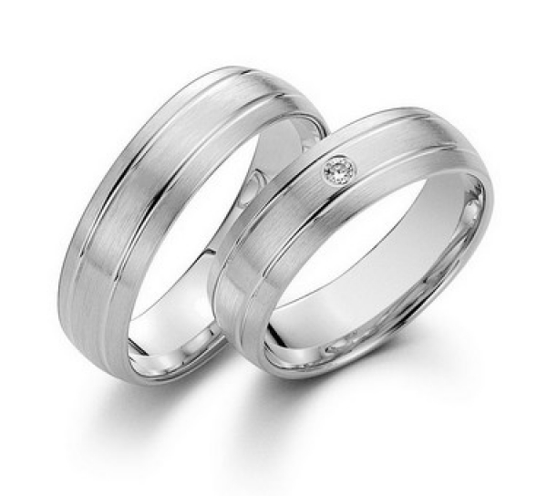 Par de aliança em prata, anatômica, com 2 frisos, uma zircônia cravejada na feminina, com 6,0mm de largura por 1,5mm de espessura.