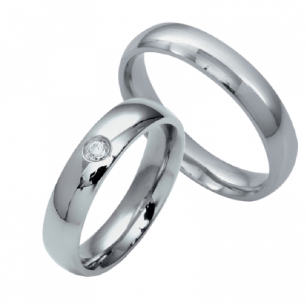 Par de aliança em prata, anatômica, uma zircônia cravejada na feminina, com 5,0mm de largura por 1,8mm de espessura.