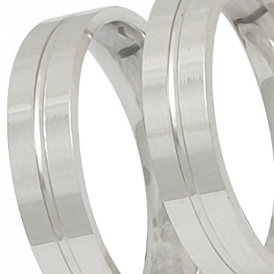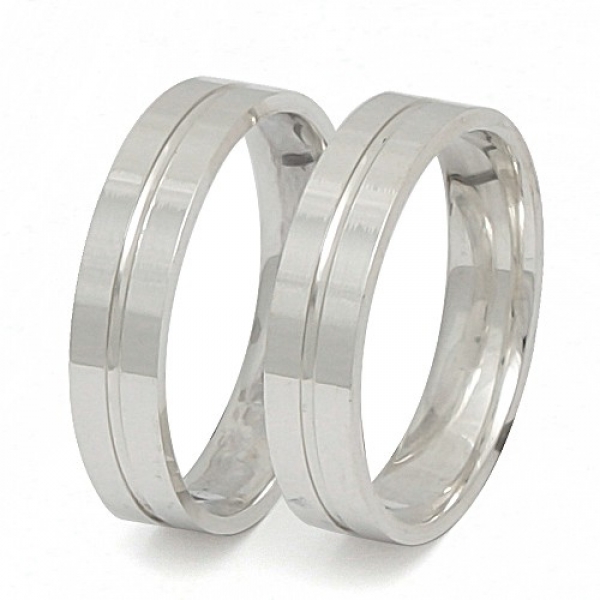 Par de aliança em prata, quadrada anatômica, com 1 friso no centro, com 5,0mm de largura por 1,5mm de espessura.