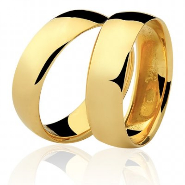 Par de aliança em ouro, anatômica, com 6,0mm de largura por 1,3mm de espessura, peso 15,0gr.