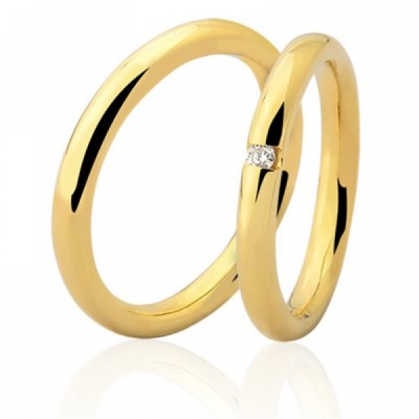 Par de aliança em ouro, anatômica, com um diamante na feminina, com 2,5mm de largura por 1,8mm de espessura, peso 9,0gr.