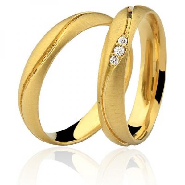 Par de aliança em ouro, anatômica, fosca, com 1 friso ondulado mais 3 diamantes na feminina, com 4,0mm de largura por 1,5mm de espessura, peso 8,5gr.