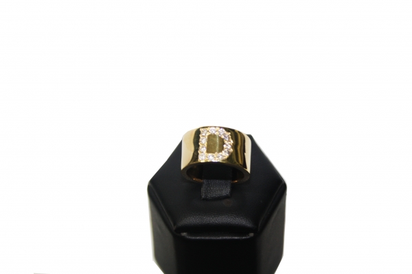 Anel em ouro, semi oco, quadrado, mais letra D cravejada com 11 Diamantes de 4 pontos cada, com 11,0mm de largura por 2,0mm de espessura, peso 10,0gr.