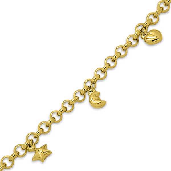 Pulseira em ouro, berloqueira, com elos portuguesa, mais pingente de estrela, lua, golfinho, coração e borboleta, com 19cm, peso 4,4gr.