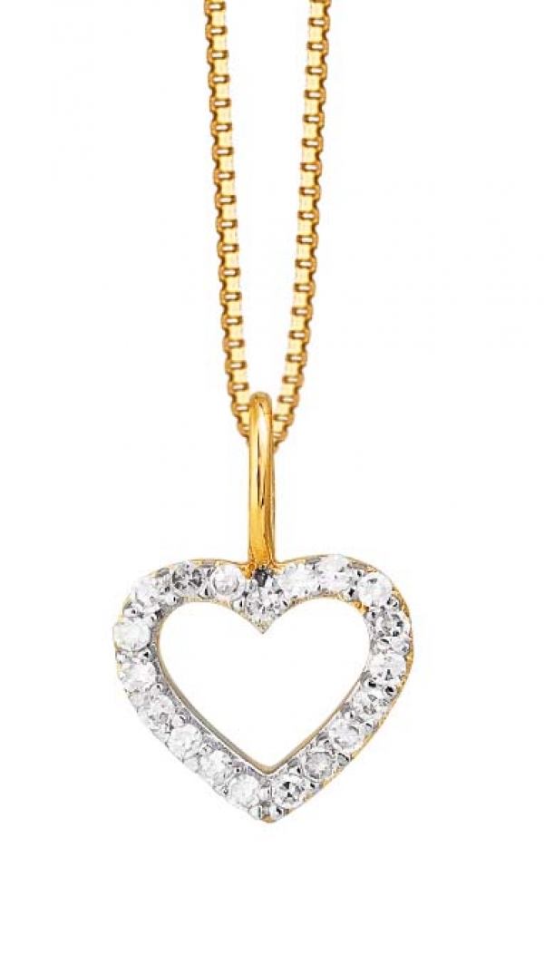 Gargantilha em ouro, com pingente em coração vazado com 20 zircônias cravejadas, com 45cm, peso 1,7gr.