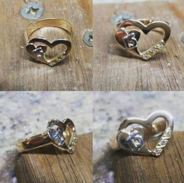 Anel 18k com detalhes em ouro branco,15 anos,com formato de coração com 3 zircônias cravejadas.