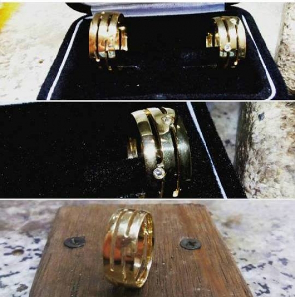 Par de aliança 12k, vasada, com 6 brilhantes na feminina, com 8,0mm de largura e 1,0mm de altura