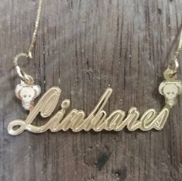 Pingente 18k nome com caveiras Harley Ouinn nas pontas, mas pode ser personalizado por sua preferência.