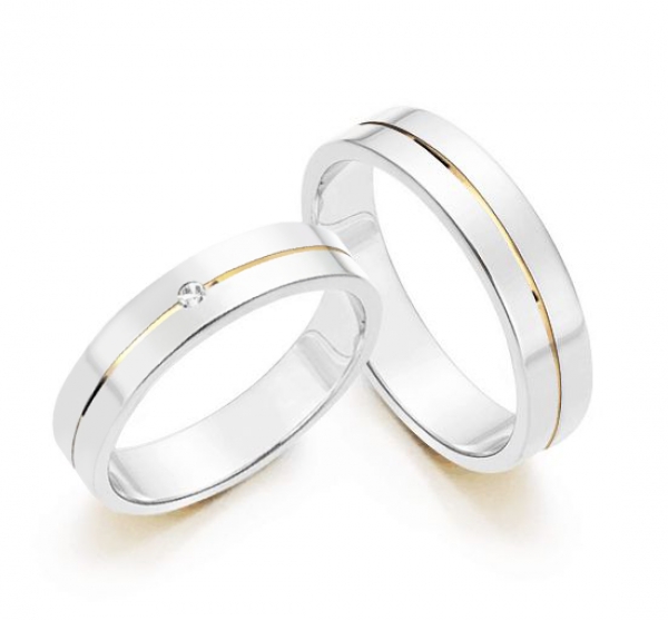 Par de aliança em prata lisa, quadrada, 1 friso com um filete em ouro no centro, uma zircônia cravejada na feminina, com 4,5mm de largura por 1,15mm de espessura.